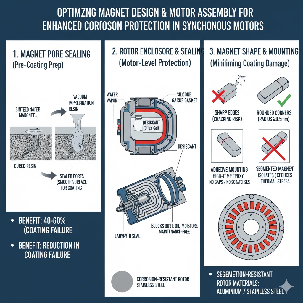 Same powłoki powierzchniowe nie wystarczą – wybór projektu zespołu magnesu i silnika odgrywa kluczową rolę w minimalizowaniu ryzyka korozji. Te optymalizacje uzupełniają powłoki i wydłużają żywotność magnesu: