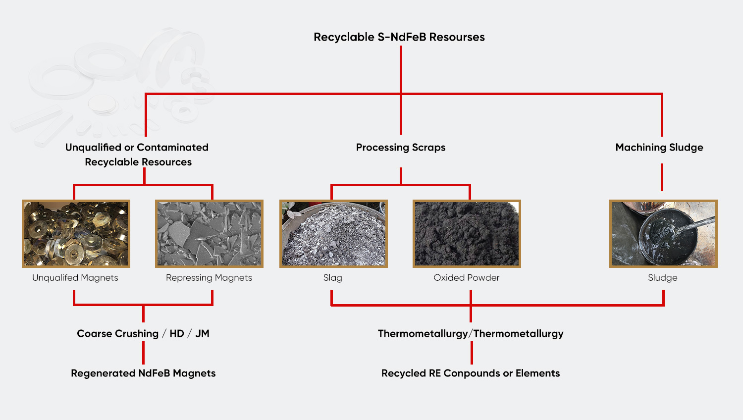 | Recykling błota magnetycznego Błoto magnetyczne powstające w procesie mielenia materiału magnetycznego służy do ekstrakcji pierwiastków ziem rzadkich w specjalnym procesie, a pozostały proszek żelaza można wykorzystać jako surowiec metalurgiczny, osiągając stopień wykorzystania zasobów odpadowych na poziomie ponad 90%. | Oczyszczanie cieczy po obróbce odpadów Ultrafiltracyjna separacja membranowa Zaawansowana technologia kombinowanego utleniania służy do oddzielania oleju i wody w odpadowym płynie obróbczym. Jakość oczyszczonej wody spełnia normę emisji pierwszego poziomu GB 8978-1996, a fazę olejową można rafinować i ponownie wykorzystać. | System recyklingu form odpadowych Utworzenie systemu zarządzania pełnym cyklem życia formy w celu wykonywania napraw okładzin laserowych lub regeneracji metodą metalurgii proszków na złomowanych formach węglikowych, zwiększając wskaźnik recyklingu materiałów formy do ponad 60%. |
